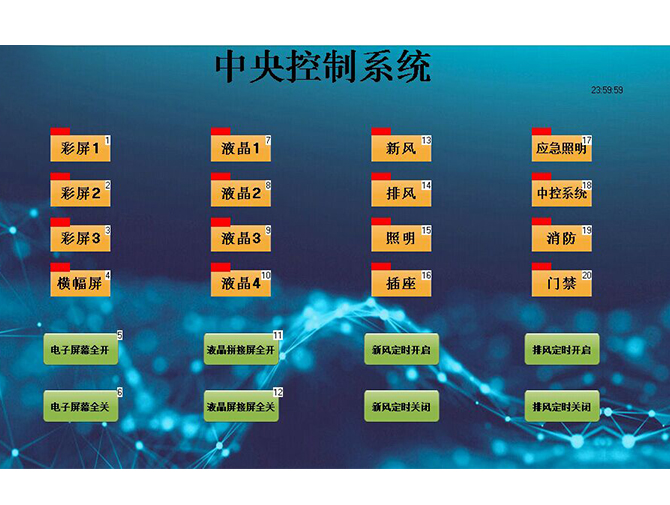該項目采用VSU總線型智能照明控制系統(tǒng),網(wǎng)關(guān)主機,電源模塊,級聯(lián)模塊,串口模塊加觸摸屏控制??赏ㄟ^中控觸摸屏一鍵控制電子屏幕、液晶拼接屏、新風定時、排風定時等。