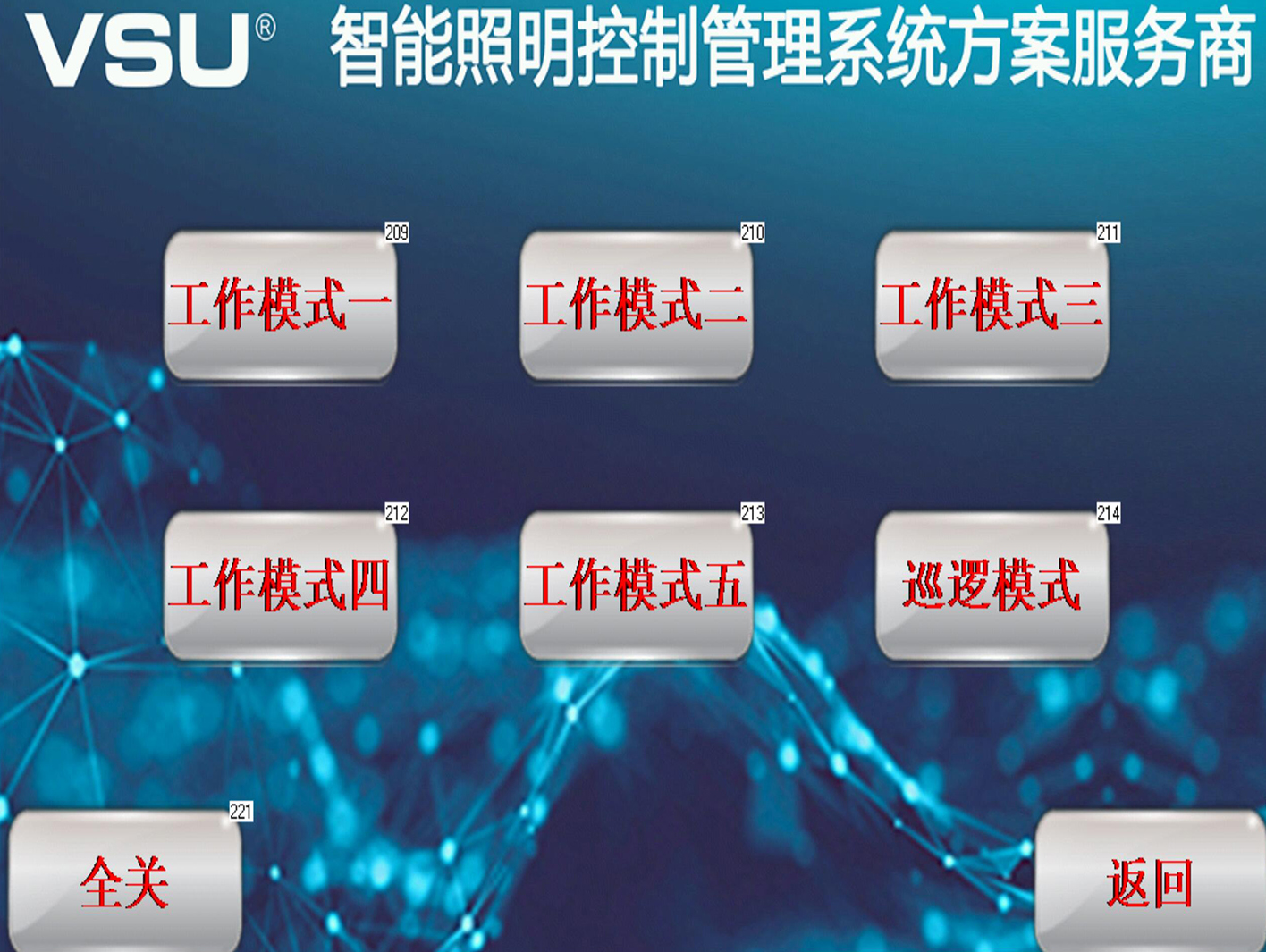 該項目中在智能照明領(lǐng)域采用的是VSU-NET總線型智能照明控制系統(tǒng),8路、12路、16路16A智能照明模塊、6鍵面板、7寸觸摸屏、電源模塊、網(wǎng)關(guān)模塊、級聯(lián)模塊等系列設備形成整個智能化照明控制系統(tǒng)。