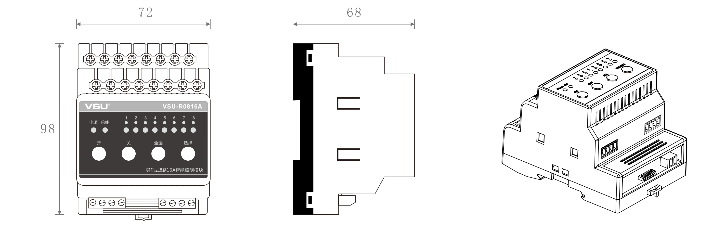 本產(chǎn)品為導(dǎo)軌式安裝,含8路智能繼電器,每回路可獨(dú)立控制3520W燈具的開關(guān),帶應(yīng)急按鍵,LED燈時時指示各個回路開關(guān)狀態(tài),可設(shè)置為互鎖控制4組窗簾開合; |