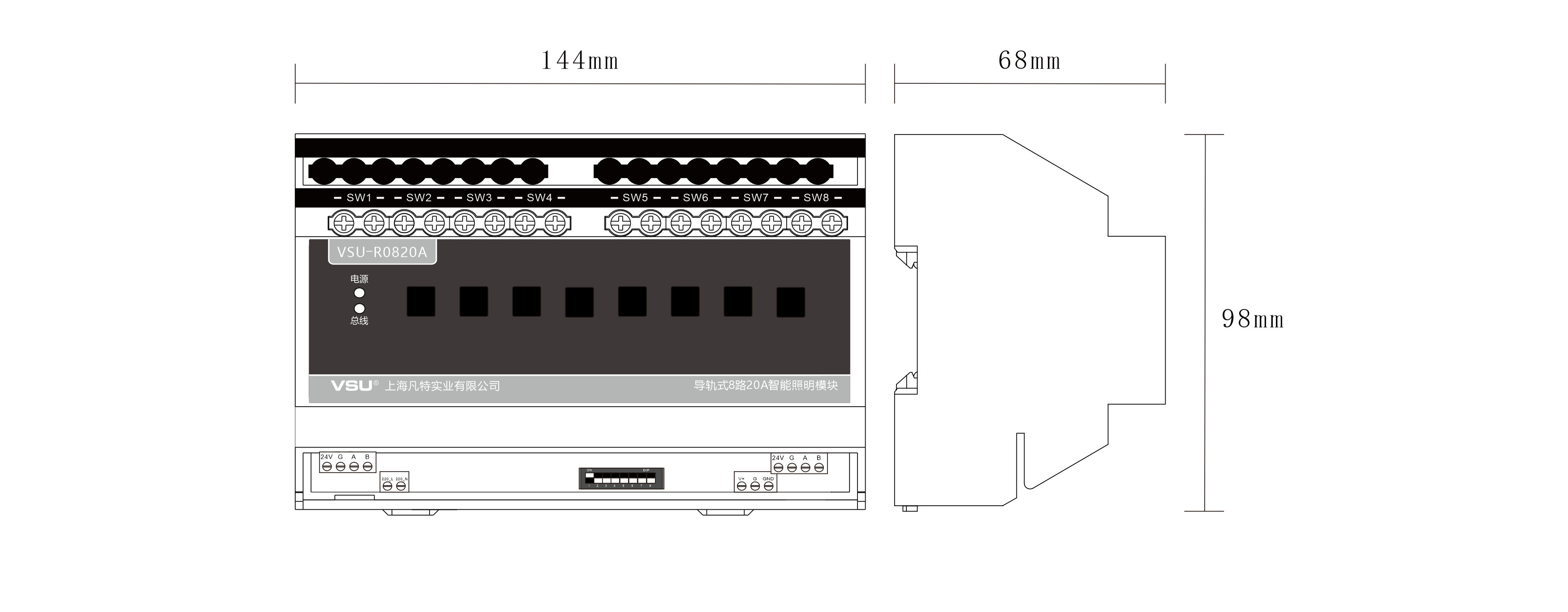 1,標(biāo)準(zhǔn)導(dǎo)軌式安裝占8個模數(shù)位;
