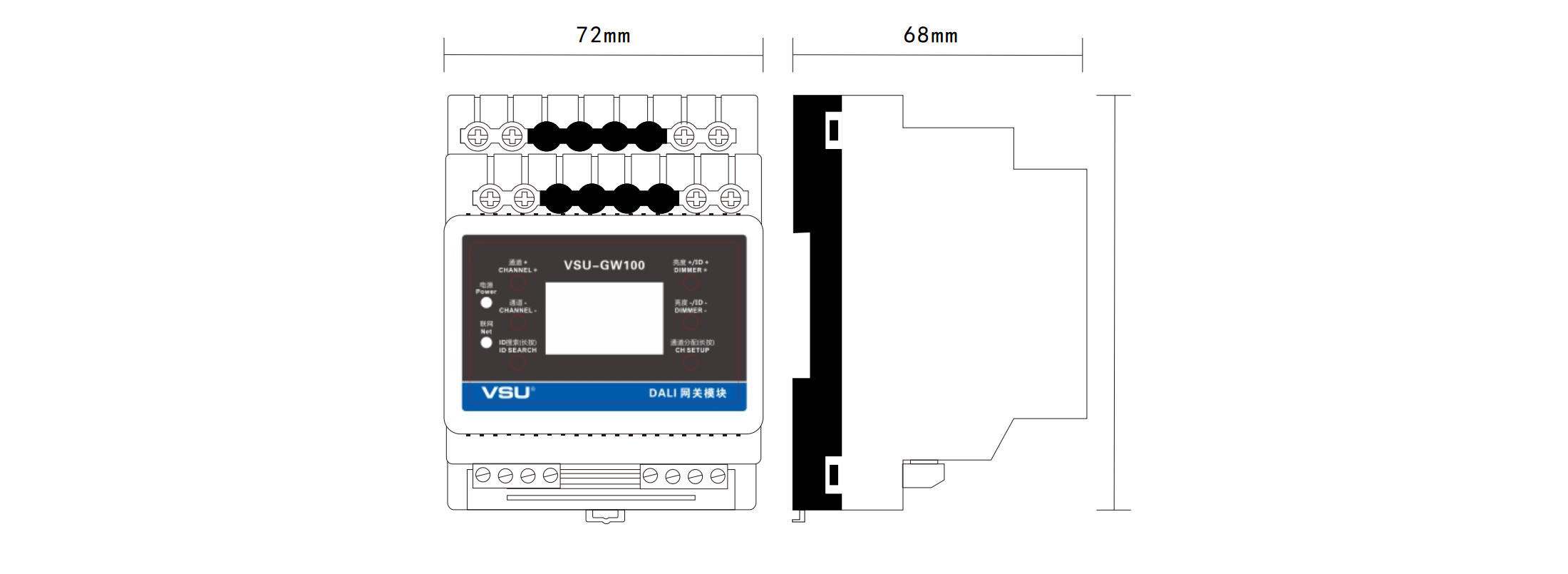 1.標(biāo)準(zhǔn)導(dǎo)軌式安裝占4個(gè)模數(shù)位; 2.VSU-Net總線信號轉(zhuǎn)換成DALI總線信號;